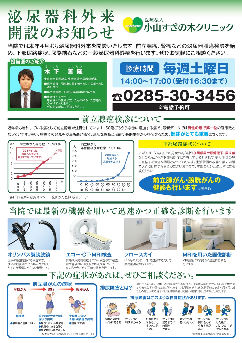 泌尿器科外来開設のお知らせ 2021.03.24 当院では2021年4月より泌尿器科外来を開設いたします。前立腺癌、腎癌などの泌尿器腫瘍検診を始め、下部尿路症状、尿路結石などの一般泌尿器科診療を行います。ぜひお気軽にご相談ください。 【診療日】毎週土曜日 【診療時間】14:00~17:00(受付16:30まで) ※電話予約可 ☎0285-30-3456 前の記事 次の記事