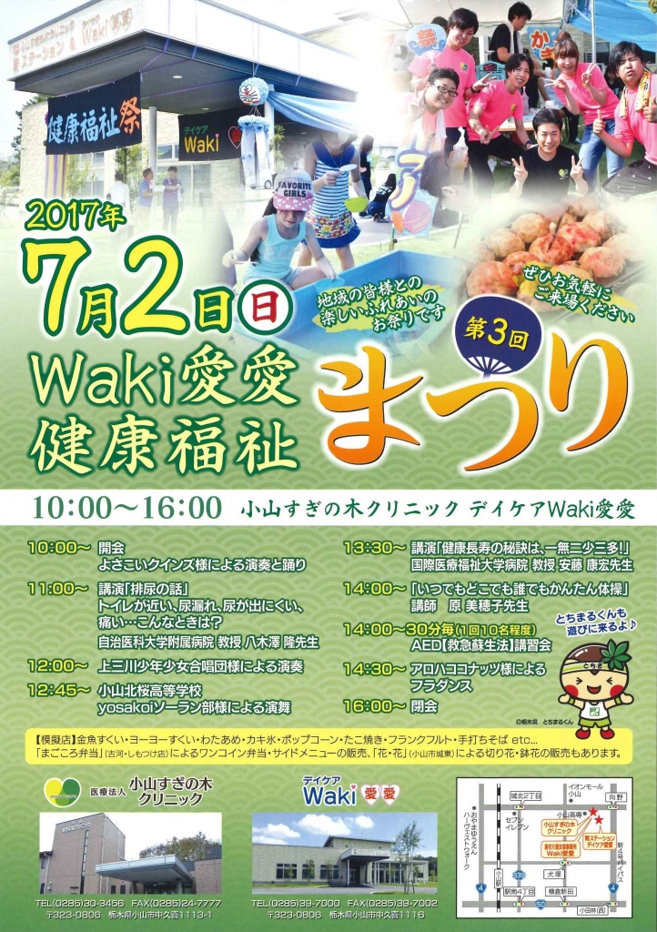 第3回 健康福祉まつり開催のお知らせ 2017.06.23 7月2日(日)10:00~16:00 雨天決行 第3回 健康福祉まつりを開催いたします。 どなたでもご参加いただけます。 お気軽にご来場ください! 前の記事 次の記事