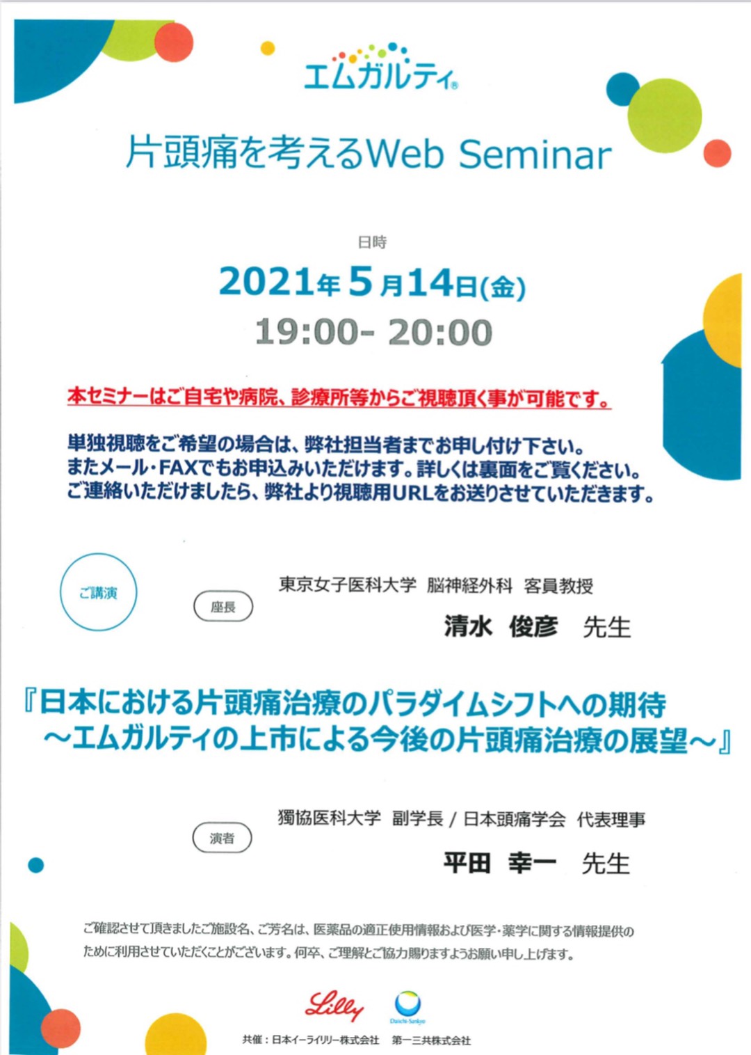 清水先生も座長として参加されますセミナーに招待していただきました。片頭痛治療の現状について、時折動画を交えながら分かりやすく学ぶことが出来ました。
