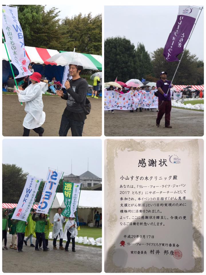 リレーフォーライフ終了 2017.09.17 リレーフォーライフとちぎ2017が無事に終了致しました。 雨天の中、49チームと他にもボランティアの方もたくさん参加されていて、盛大なるイベントだったと感じております。 イベントへの参加をさせていただきましてありがとうございました。また、参加して下さったスタッフの皆様にも感謝申し上げます。 大会本部より感謝状も頂きました。 お疲れ様でした! 前の記事 次の記事